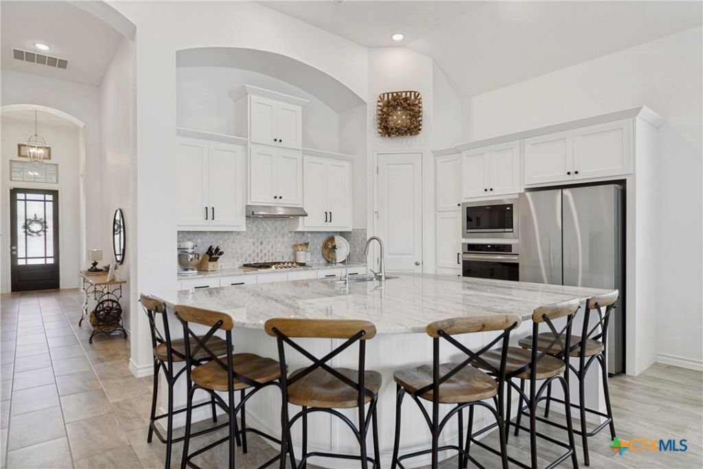 Located in the gated community of Ranches at Creekside, this Highland Home offers 2,276 sq ft of thoughtfully designed single-story living. Featuring 4 bedrooms, 3 baths, and a dedicated office with built-in cabinetry and dual workspaces, the layout is both functional and inviting. Soaring ceilings throughout the home create an airy, expansive feel, while abundant natural light enhances the open concept layout. A cozy fireplace adds warmth and character to the living space. The kitchen includes an oversized island, gas cooking, walk-in pantry, reverse osmosis system, and a built-in butler's bar with additional storage - ideal for both everyday living and entertaining. The spacious primary suite features upgraded tile floors and a luxurious bath with double vanities, a makeup counter, soaking tub, and separate shower. An oversized 2.5-car garage provides valuable extra storage space. Enjoy community amenities including a pool, playground, and sidewalks, along with the benefit of no MUD tax, all just minutes from downtown Boerne and highly regarded Boerne ISD schools.
