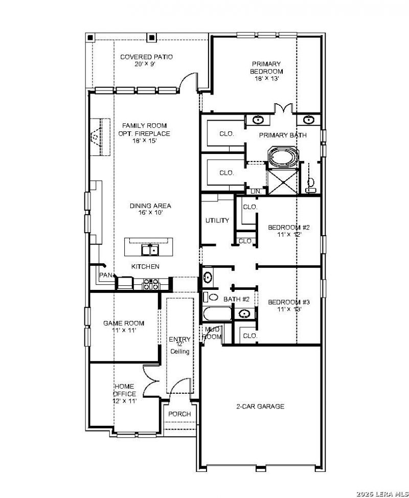 Welcoming entry framed by home office and game room. Family room with a wall of windows opens to kitchen and dining area. Island kitchen with built-in seating space, a 5-burner gas cooktop, and a corner walk-in pantry. Secluded primary suite features three large windows. Primary bathroom offers a double door entry, dual vanities, two walk-in closets, garden tub and a separate glass enclosed shower. Secondary bedrooms offer walk-in closets. A Hollywood bathroom and a utility room complete this design. Covered backyard patio. Landscaping features a 6-zone sprinkler system. Mud room just off the two-car garage.