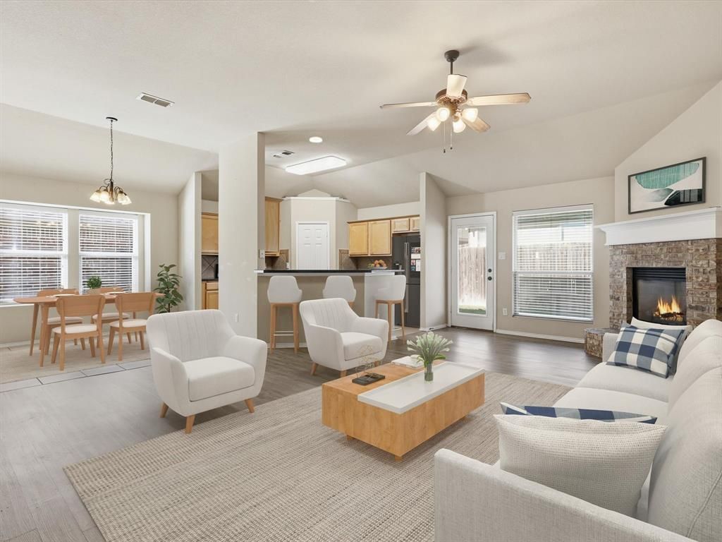 Welcome to this inviting single-story home located in the desirable Eagle Ranch community of Fort Worth. This well-maintained residence offers a bright and open layout with a spacious living area anchored by a cozy gas fireplace, creating a warm and welcoming atmosphere. The kitchen flows easily into the dining space for effortless everyday living, and tile flooring in key areas adds durability while newer carpet in the bedrooms enhances comfort. The private primary suite features a garden tub, separate shower, dual sinks, and a walk-in closet, while two additional bedrooms provide flexibility for guests, or family. For those working from home, the flex space is a great room for an office. It could also be used as a second living space, or playroom...lots of options! Enjoy a covered back patio perfect for morning coffee or relaxing evenings, along with a manageable yard that is easy to maintain. Additional highlights include an attached two-car garage, neutral finishes throughout, and the charm of a quiet, established neighborhood close to shopping, dining, parks, and major roadways. This home offers comfortable living in a fantastic location—ready for its next tenant to move in and enjoy.